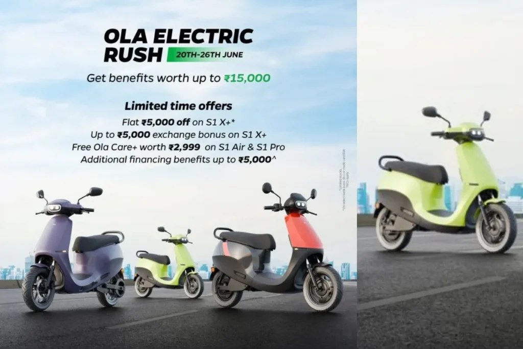 आपको बता दें, ओला इलेक्ट्रिक की तरफ से एक जानकारी शेयर की गई है , जिसमें बताया गया है कि, 26 जून तक ग्राहक 15000 तक मिल रही छूट का लाभ उठा सकते हैं। ये डील 20 जून से लेकर 26 जून तक के लिए ही है। जिसमें 5000 की छूट OLA S1X+ Electric Scooter पर मिल रही है। वहीं, 5000 का एक्सचेंज ऑफर Ola S1X+ Electric Scooter पर मिल रहा है। इसके साथ ही OLA S1 Air Electric Scooter और OLA S1 Air+ Electric Scooter पर 2999 की फ्री ओला केयर छूट मिल रही है। इसके साथ ही अन्य 5000 के लाभ भी मिल रहे हैं। अगर कोई ग्राहक इनमें से कोई भी इलेक्ट्रिक स्कूटर खरीदता है तो उसे ये लाभ इसी डील के हिसाब से ही मिलेगा।