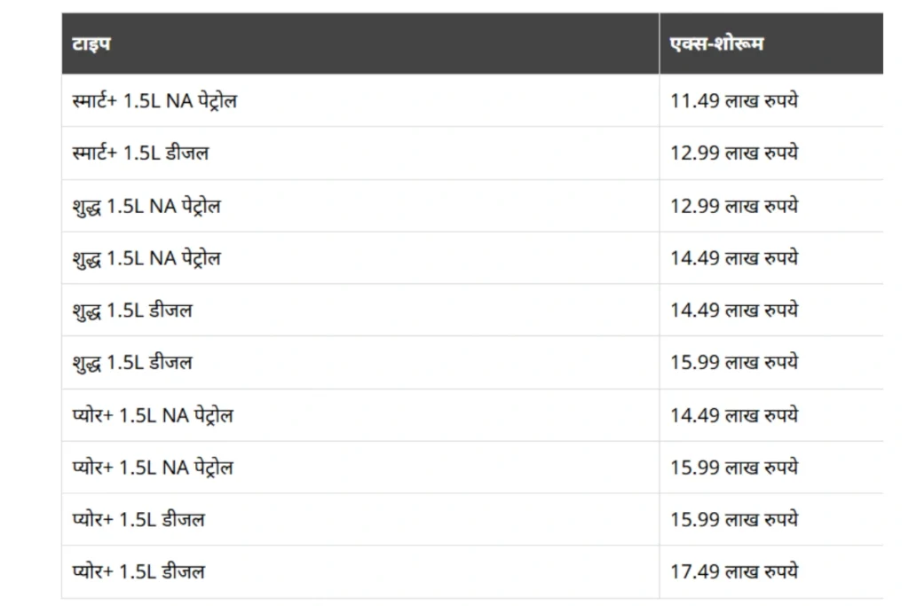 कार मेकर ने टाटा सिएरा के एंट्री लेवल स्मार्ट प्लस वेरिएंट की कीमतें सबसे पहले बता दी थी। इसका दाम 11.49 लाख रुपये और 12.99 लाख रुपये एक्सशोरूम रखा गया है। प्योर वेरिएंट का दाम 12.99 से 15.99 लाख रुपये के बीच है। प्योर प्लस वेरिएंट का प्राइस 14.49 से 17.49 लाख रुपये है।एडवेंचर वेरिएंट का दाम 15.29 लाख रुपये से शुरू होता है। एडवेंचर प्लस वेरिएंट का प्राइस 17.99 लाख रुपये का है। वहीं, कार कंपनी ने अभी तक एक्म्प्लिश्ड और एक्म्प्लिश्ड प्लस वेरिएंट की कीमतों का खुलासा नहीं किया है।
