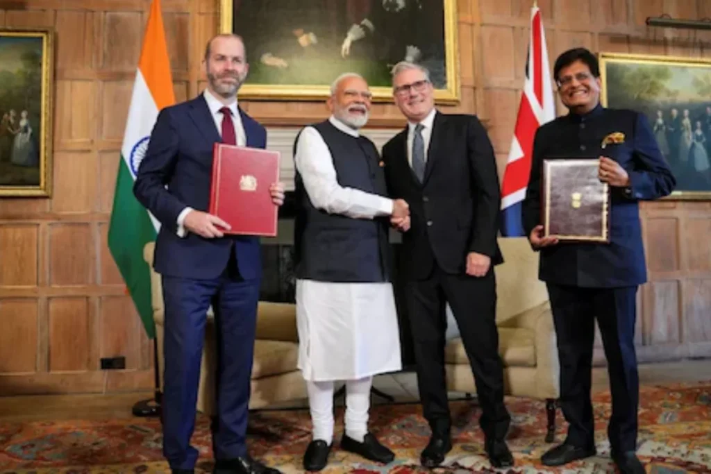India UK Free Trade Deal: भारत और यूके के बीच फ्री ट्रेड डील होने के बाद दोनों देशों के बीच व्यापार समझौते और अर्थव्यवस्था में बढ़ोतरी होने की उम्मीद है। मालूम हो कि भारत के पीएम अपने विदेशी दौरे पर है, जहां वह यूके पहुंचे थे। पीएम मोदी और ब्रिटिश पीएम कीर स्टार्मर के लंदन में मुलाकात के दौरान फ्री ट्रेड डील पर हस्ताक्षर हुए। बड़ी मात्रा में दोनों देशों के बीच आयात और निर्यात किया जाता है। वहीं फ्री ट्रेड होने के बाद कई चीजें सस्ती होने की उम्मीद है। आज हम इस लेख के माध्यम से आपको बताएंगे कि कौन सी चीजें सस्ती होगी और भारत के लिए यह कैसे गेमचेंजर साबित हो सकता है।