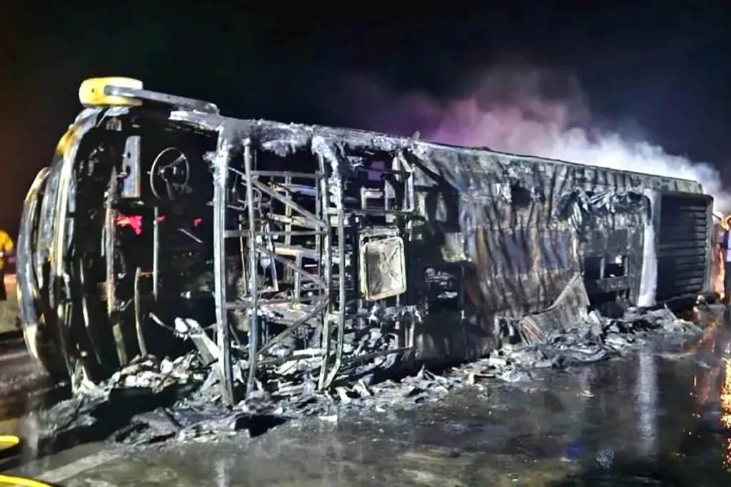 डिवाइडर से टकराने के बाद बस में लगी आग