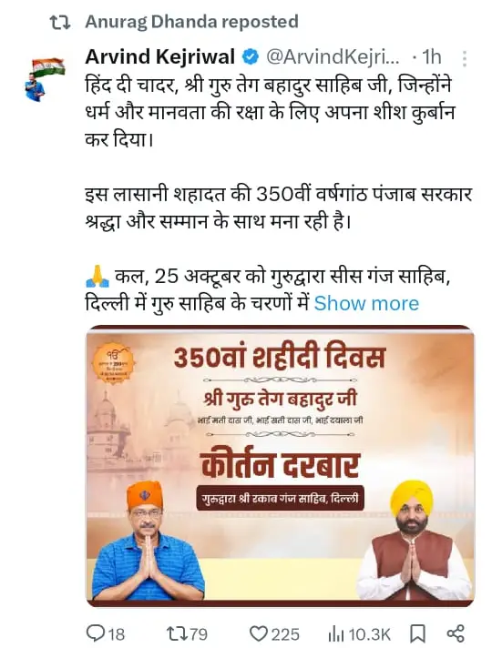 आप संयोजक अरविंद केजरीवाल के एक्स हैंडल से एक पोस्ट जारी किया गया है जिसमें लोगों के नाम निमंत्रण है। दरअसल, गुरु तेग बहादुर साहिब जी की 350वीं वर्षगांठ पर पंजाब सरकार कई कार्यक्रमों का आयोजन करेगी। आगामी कल 25 अक्टूबर को गुरुद्वारा सीस गंज साहिब में अरदास के साथ इसका आगाज होना है।
