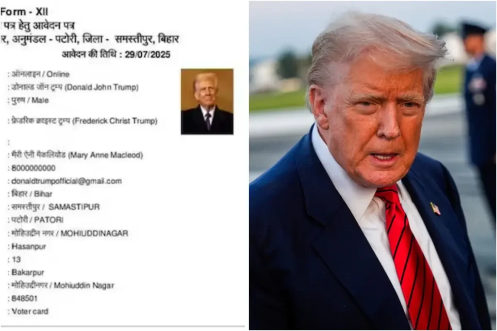 बिहार में स्पेशल इंटेसिव रिवीजन के लिए आवश्यक निवास प्रमाण पत्र हेतु जारी आवेदन के बीच एक हैरान करने वाला मामला सामने आया है। समस्तीपुर के मोहिउद्दीननगर प्रखंड कार्यालय में एक ऐसा आवेदन सामने आया है जिसमें अमेरिकी राष्ट्रपति डोनाल्ड ट्रंप के नाम से निवास प्रमाण पत्र जारी करने की अपील की गई है। आज तक की एक रिपोर्ट के मुताबिक आवेदन के मुताबिक डोनाल्ड ट्रंप का पता ग्राम हसनपुर, वार्ड संख्या 13, पोस्ट बाकरपुर, थाना और प्रखंड मोहिउद्दीननगर, जिला समस्तीपुर दर्ज है। ऑनलाइन आवेदन संख्या BRCCO/2025/17989735 के तहत डोनाल्ड ट्रंप के नाम से निवास प्रमाण पत्र जारी करने की अपील की गई है।
