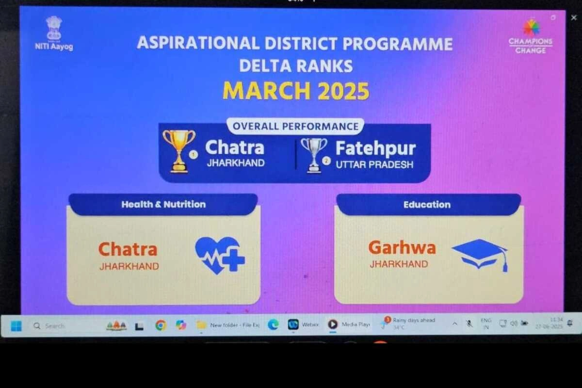 NITI Aayog: नीति आयोग द्वारा आयोजित ऑनलाइन समीक्षा बैठक में मार्च 2025 की डेल्टा रैंकिंग के अनुसार चतरा जिला ने उल्लेखनीय प्रदर्शन करते हुए देश के 112 आकांक्षी जिलों में प्रथम स्थान प्राप्त किया है। यह उपलब्धि जिला प्रशासन एवं विभिन्न विभागों के संयुक्त प्रयासों, नवाचारों तथा योजनाओं के प्रभावी क्रियान्वयन का प्रतिफल है।