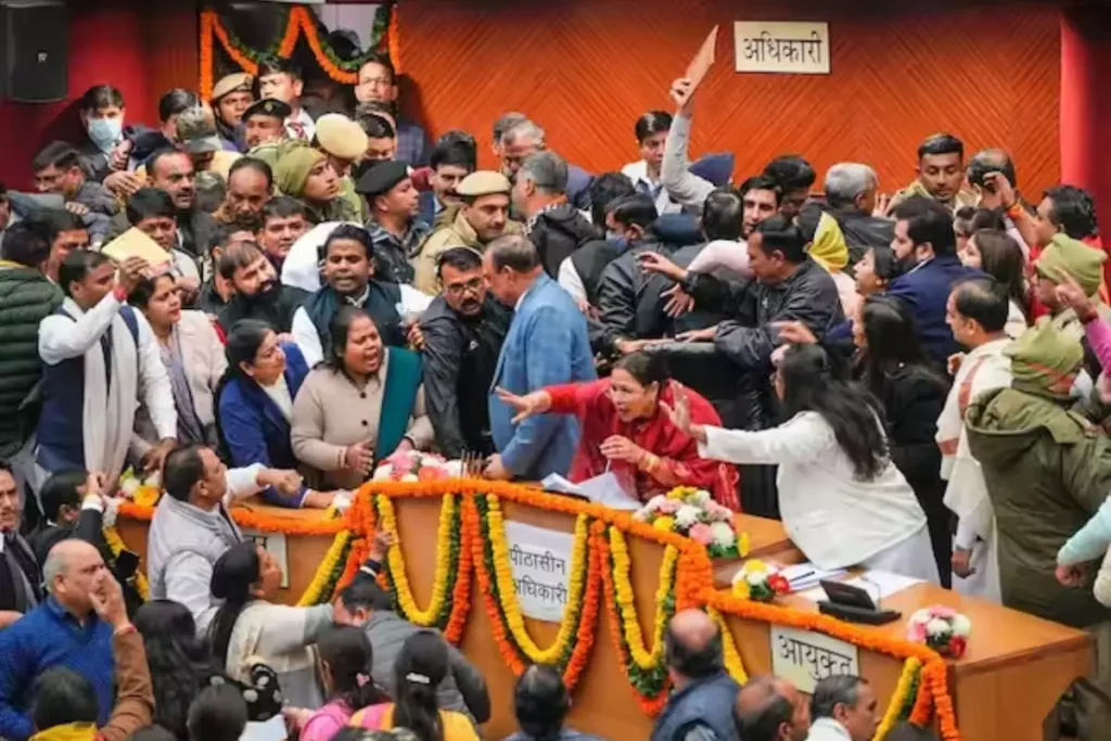 Delhi Mayor Election: दिल्ली के मेयर चुनाव की जंग अब तेज हो गई है। जो कल सोमवार को तीसरी बार वोटिंग टल जाने के कारण सदन से निकलकर सड़कों पर पहुंच गई है। आज दोनों पार्टियों के कार्यकर्ताओं की फौज इसको लेकर एक दूसरे के पार्टी कार्यालयों के सामने संग्राम करने के लिए उतर गई। दिल्ली नगर निगम के मेयर और डिप्टी मेयर का पद कल तीसरी बार भी तय नहीं हो पाया। मनोनीत पार्षदों की वोटिंग को लेकर फिर से सदन में एक बार फिर भारी हंगामा हो गया था और दोनों दल एक दूसरे के सामने आ गए थे। जिसके बाद सदन को अगली तारीख तय होने तक अनिश्चितकाल के लिए स्थगित कर दिया गया।