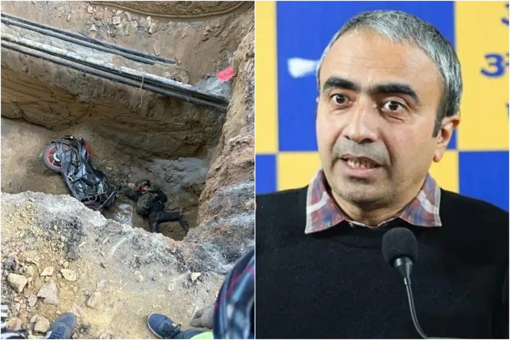 आप नेता ने पूर्व मंत्री सौरभ भारद्वाज का एक पोस्ट साझा किया है। इस पोस्ट में 4 विचलित करने वाली तस्वीरें हैं। तस्वीरों में एक शख्स अपनी बाइक के साथ गड्ढे में गिरा नजर आ रहा है। इस हादसे में चपेट में आने से बाइक सवार शख्स की मौत हो गई है। इसको लेकर अनुराग ढ़ांडा लिखते हैं कि “एक युवा तड़प तड़प कर मर गया और मुख्यमंत्री रेखा गुप्ता चैन की नींद सोती रही।” ये ऐसा तंज है जो पूरी सिस्टम को कटघरे में खड़ा करता है।