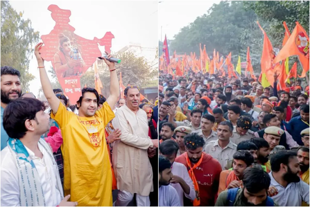 दिल्ली के डेरा भाटी कलां गांव से फरीदाबाद के दशहरा मैदान तक सनातन हिंदू एकता पदयात्रा निकली है। इस यात्रा के दूसरे दिन आज धीरेन्द्र शास्त्री के साथ कई संत शामिल हुए। इसके अलावा ग्रेट खली ने भी सनातन यात्रा में शिरकत कर बागेश्वर धाम सरकार की आवाज को आगे बढ़ाया। खली के अलावा पूर्व क्रिकेटर शिखर धवन भी आचार्य धीरेन्द्र शास्त्री की इस यात्रा में शामिल हुए हैं। 2025 के दूसरे दिन की शुरुआत की।