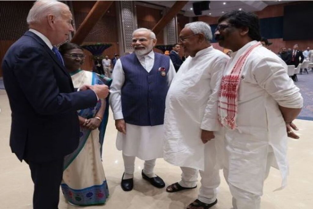 इस जी20 सम्मेलन (G20 Summit) की डिनर पार्टी के दौरान कई राज्यों के मुख्यमंत्री पहुंचे तो वहीं कुछ ने विभिन्न कारणों का हवाला देकर पार्टी में पहुंचने में अपनी असमर्थता जताई। इस दौरान सबसे खास रहा बिहार के मुख्यमंत्री नीतीश कुमार का पहुंचना, जहां प्रधानमंत्री मोदी ने स्वयं उनकी मुलाकात अमेरिकी राष्ट्रपति जो बाइडेन से कराई। इसकी तस्वीर भी पीएम मोदी ने अपने सोशल मीडिया हैंडल इंस्टाग्राम से शेयर की है। इस तस्वीर में नीतीश कुमार के साथ झारखंड के मुख्यमंत्री हेमंत सोरेन भी नजर आ रहे हैं।