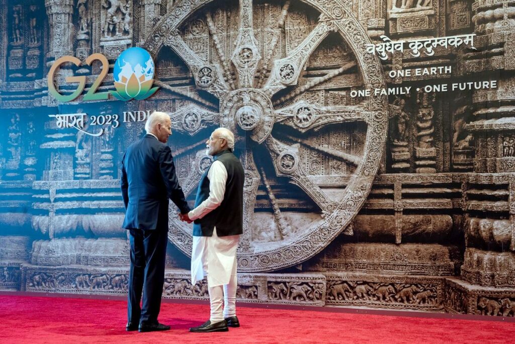 लेकिन इन सब में सबकी नज़रें उसे समय ठहर गई जब दुनिया का सबसे पुराना लोकतांत्रिक देश और दुनिया का सबसे बड़ा लोकतांत्रिक देश के दो नेता एक साथ खड़े हुए यानी की भारत के प्रधानमंत्री नरेंद्र मोदी ने भारत मंडपम में अमेरिकी राष्ट्रपति जो बाइडेन का स्वागत किया। जैसे ही जो बाइडेन स्वागत स्थल पर पहुंचे। तो भारत के प्रधानमंत्री नरेंद्र मोदी ने उनका आवभगत किया। इसके साथ ही उनके पीछे लगे कोणार्क चक्र के बारें में बाइडेन को बताया।