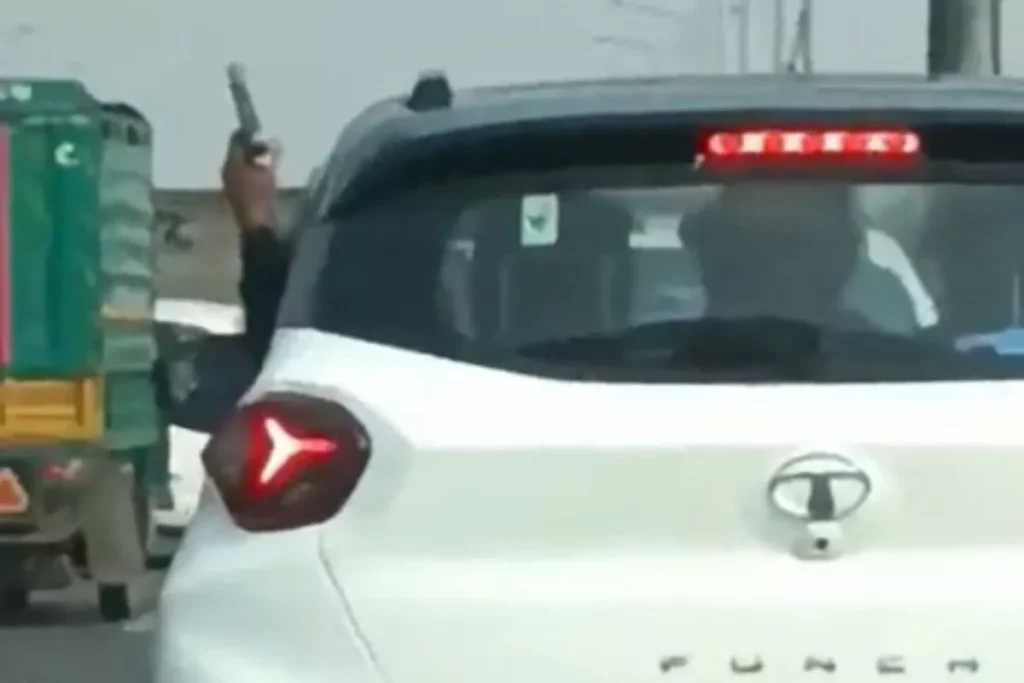 हाईवे पर गाड़ी में बैठे युवक ने हवा में लहराई पिस्तौल