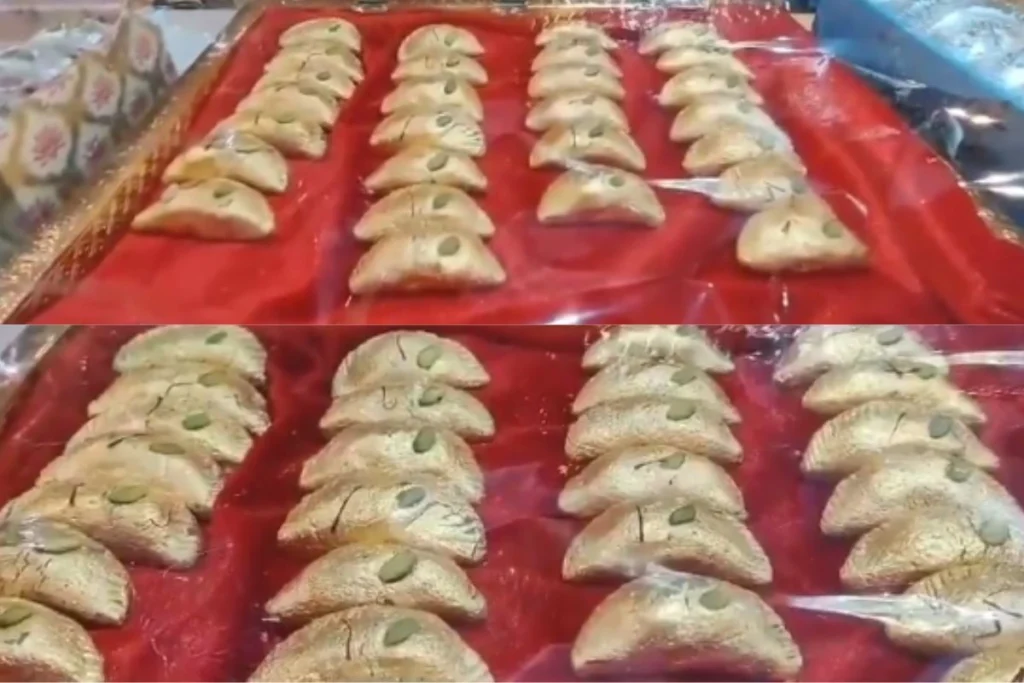 इसके साथ ही कैप्शन में लिखा है, “होली पर गुझिया का रेट 50 हजार रुपए किलो। विदेशी ड्राइफ्रूट्स और गोल्ड वर्क से ये गुझिया UP में गोंडा जिले के मिठाई व्यापारी ने बनवाई है। पता नहीं कौन खरीदता होगा?”