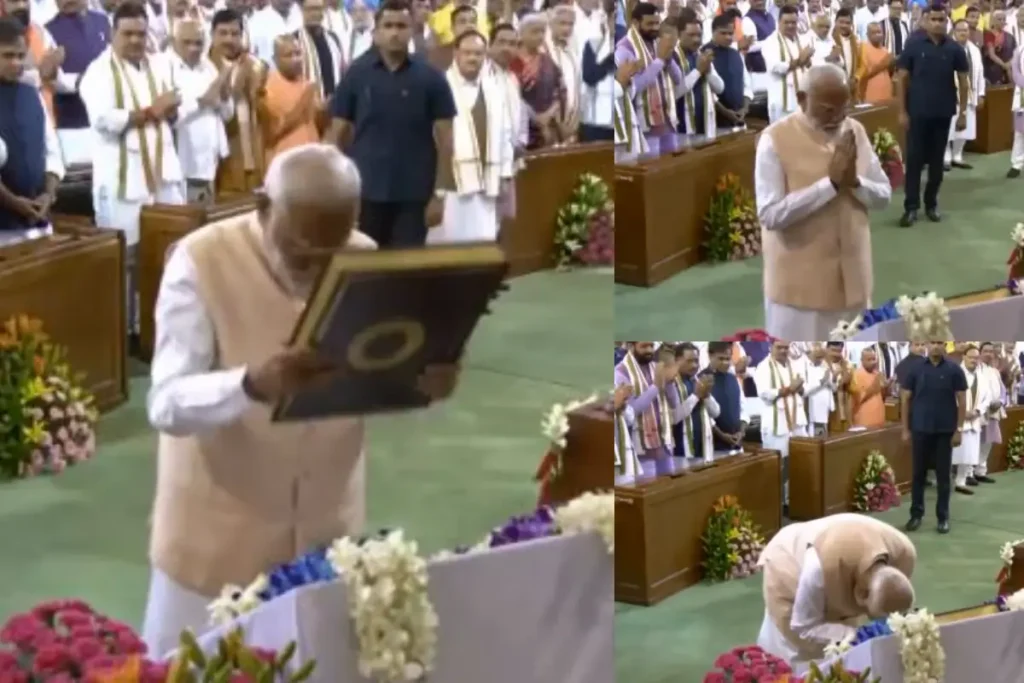 नरेन्द्र मोदी ने आज राजधानी दिल्ली में स्थित संविधान सदन के केंद्रीय कक्ष में एनडीए की बैठक में पहुंच कर सबसे पहले भारत के संविधान को माथे से लगाया और नतमस्तक हो गए। नरेन्द्र मोदी के इस खास अंदाज का वीडियो समाचार एजेंसी एएनआई की ओर से जारी किया गया है और इसको लेकर खूब सुर्खियां बन रही हैं।