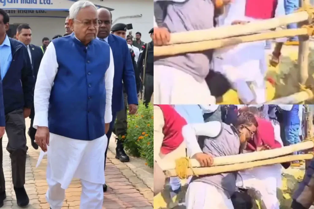 Nitish Kumar: तमाम राजनीतिक यात्राओं की गवाह बन चुकी बिहार (Bihar) की धरा पर एक और यात्रा की शुरुआत हो गई है। मुख्यमंत्री नीतीश कुमार के नेतृत्व में JDU ने प्रगति यात्रा (Pragati Yatra) को हरी झंडी दिखा दी है। इसी कड़ी में मुख्यमंत्री नीतीश कुमार (CM Nitish Kumar) आज पश्चिम चंपारण के बेतिया में पहुंचे। बेतिया पहुंचने के दौरान मुख्यमंत्री से मिलने और उन्हें गुलदस्ता देने की होड़ मच गई। इसी दौरान एक ऐसा वाकया हुआ जिसने ध्यान अपनी ओर आकर्षित किया। दरअसल, JDU के तमाम कार्यकर्ता सीएम नीतीश कुमार (Nitish Kumar) को गुलदस्ता देने के लिए उमड़ पड़े। इसी दौरान कई नेता सड़क किनारे बने गड्ढे में जा गिरे। इस पूरे घटनाक्रम को देखते हुए मुख्यमंत्री नीतीश कुमार और मंत्री अशोक चौधरी आगे बढ़ गए। नीतीश कुमार के प्रगति यात्रा से जुड़ा ये वीडियो सोशल मीडिया पर सुर्खियां बटोर रहा है।
