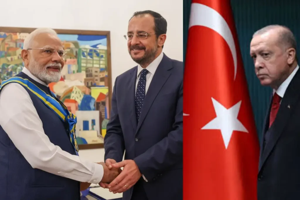 नई रणनीति अपनाकर भारत को घेरने चले राष्ट्रपति अर्दोआन खुद अपने ही जाल में फंस गए हैं। जहां एक ओर अर्दोआन एशिया में एंट्री लेकर पाकिस्तान के हिमायती बन रहे थे। वहां उन्हीं के पड़ोसी साइप्रस ने प्रेसिडेंट अर्दोआन को ललकारा है। PM Modi को साइप्रस बुलाकर सर्वोच्च सम्मान से नवाज देना, अर्दोआन के लिए करारा थप्पड़ जैसा है। कहां अर्दोआन पाकिस्तान के हिमायती बनकर भारत के खिलाफ चाल चल रहे थे और कहां आज उन्हीं के पड़ोसी साइप्रस ने पीएम मोदी को सर्वोच्च सम्मान दिया है। ये भारत की ऐसी कुटनीतिक जीत है जिसने पाकिस्तान के नए दोस्त तुर्किए की हेकड़ी निकाल दी है।