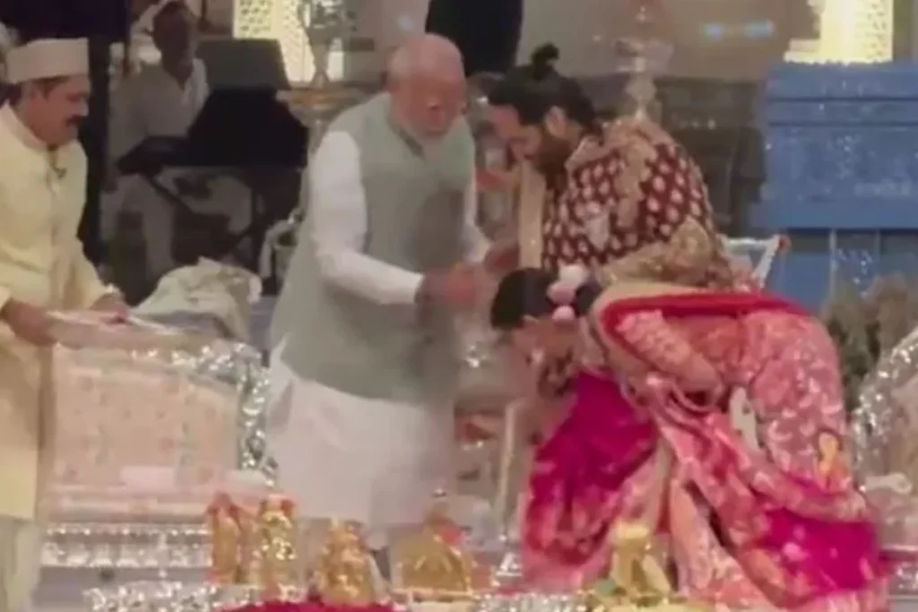 भारत के प्रधानमंत्री नरेंद्र मोदी जब शादीशुदा जोड़े को आशीर्वाद देने पहुंचे तो मुकेश अंबानी और उनकी पत्नी नीता अंबानी हाथ जोड़कर उनका अभिवादन करते नजर आए । पीएम नरेंद्र मोदी ने न सिर्फ समारोह में शिरकत कर उसकी शान बढ़ाई बल्कि अनंत और राधिका को एक खास तोहफा भी दिया। अनंत और राधिका ने भारतीय रीति रिवाजों के अनुसार नरेंद्र मोदी जी का सम्मान किया और उनके पैर छूकर आशीर्वाद प्राप्त किया।