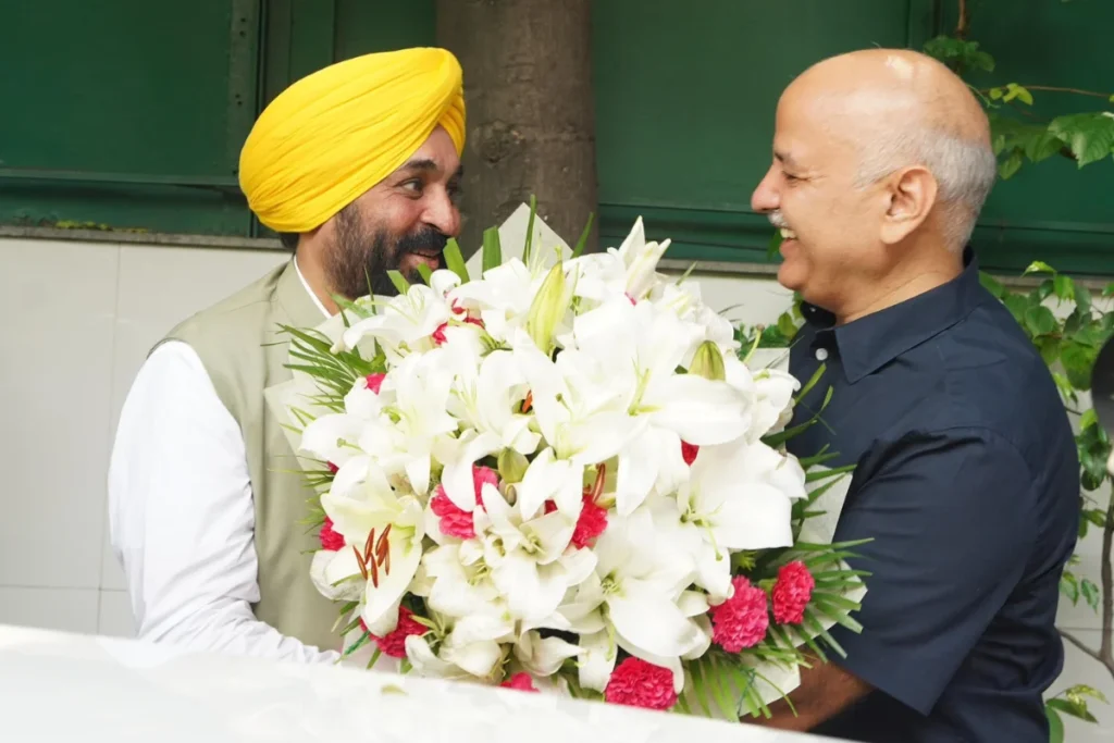 आपको बता दें कि पंजाब के मुख्यमंत्री भगवंत मान मनीष सिसोदिया के घर पहुंचे, जहां वह और उनकी पत्नी मौजूद थी। वरिष्ठ नेता मनीष सिसोदिया ने सीएम मान का फूलों के गुलदस्तों के साथ स्वागत किया। वहीं आप पंजाब ने अपने सोशल मीडिया प्लेटफार्म एक्स पर लिखा कि