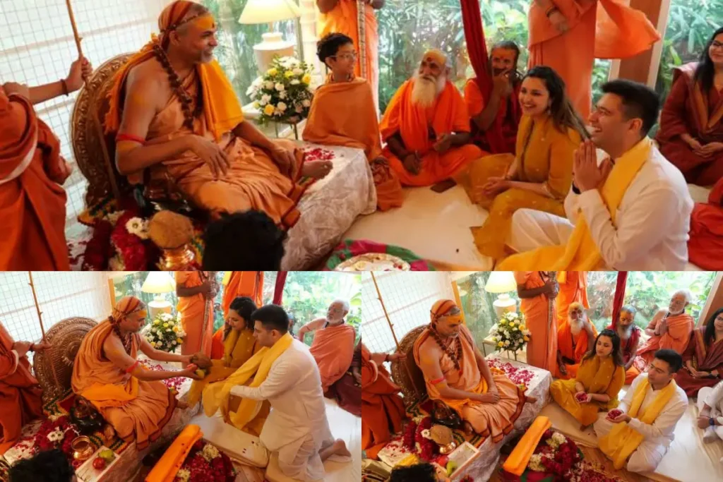 परिणीति चोपड़ा भी अपने पति राघव के साथ ट्रेडिशनल लुक में देखी जा सकती हैं। दोनों एक साथ बैठकर शंकराचार्य स्वामी का आशीर्वाद लेते नजर आ रहे हैं।