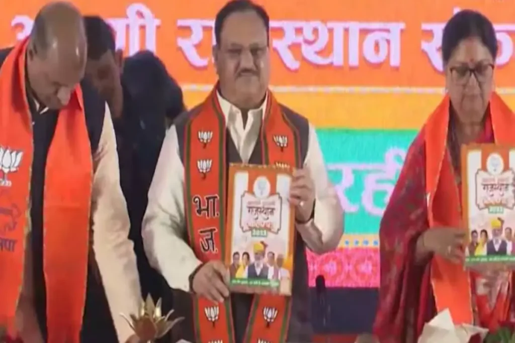 भाजपा ने राजस्थान विधानसभा चुनाव को देखे हुए अपने घोषणा पत्र जारी कर दिए हैं। इसके तहत राज्य की जनता के लिए कई बड़े ऐलान किए गए हैं। भाजपा की ओर से राष्ट्रीय अध्यक्ष जेपी नड्डा, पूर्व सीएम वसुंधरा राजे व अन्य वरिष्ठ नेताओं की उपस्थिति में घोषणा पत्र जारी किया गया। इस दौरान कहा गया है कि राज्य में भाजपा की सरकार आने पर पेपर लीक, खनन, पीएम आवास, फर्टिलाइजर, मिड डे मील आदि घोटाले की जांच के लिए SIT का गठन किया जाएगा। इसके अलावा राज्य में आर्थिक रुप से कमजोर परिवारों के छात्रों को 1200 रुपए की वार्षिक सहायता दी जाएगी जिससे कि वे अपना पठन-पाठन की प्रक्रिया को जारी रख सकें। वहीं बच्चियों के जन्म होने पर लाडो प्रोत्साहन योजना के तहत उनके नाम से 2 लाख रुपये का बॉन्ड उपलब्ध कराया जाएगा।