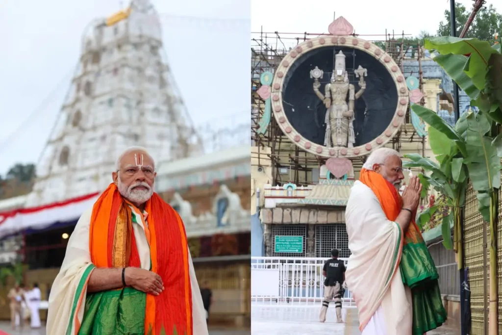 देश के प्रमुख धार्मिक स्थलों में से एक तिरुमाला के श्री वेंकटेश्वर स्वामी मंदिर में आज पीएम मोदी भी पहुंचे। उन्होंने श्री बालाजी के दरबार में पहुंचकर दर्शन-पूजन भी किया। पीएम मोदी के तंलेगाना दौरे की जानकारी उनके आधिकारिक सोशल मीडिया हैंडल से सामने आई। सोशल मीडिया हैंडल से लिखा गया कि पीएम मोदी ने देश के 140 करोड़ नागरिकों के अच्छे स्वास्थ्य, कल्याण और समृद्धि के लिए तिरुमाला के श्री वेंकटेश्वर स्वामी मंदिर में प्रार्थना की है। खबर है कि पीएम इसके बाद से तेलंगाना में कई चुनावी जनसभा को संबोधित करने वाले हैं।