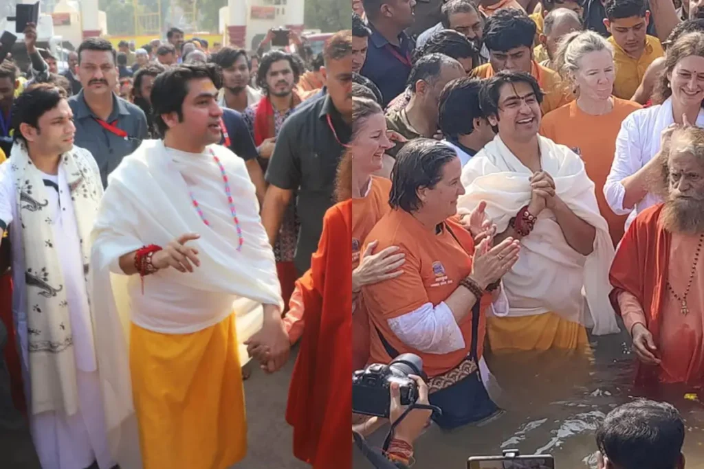 Maha Kumbh 2025: हिंदुत्व के प्रखर ध्वजवाहक और लाखों अनुयायियों के चहेते धीरेन्द्र कृष्ण शास्त्री ने अंतत: संगम में आस्था की डुबकी लगा ली है। Dhirendra Krishna Shastri ने संगम में 5 डुबकियों के पांच खास उद्देश्य बताए हैं। इसके साथ ही उन्होंने सनातन धर्म को लेकर एक लकीर खींच दी है। महाकुंभ 2025 का हिस्सा बनने प्रयागराज पहुंचे, धीरेन्द्र शास्त्री ने स्पष्ट किया कि मेरी पहली डुबकी हिंदू राष्ट्र के लिए है। उन्होंने बागेश्वर धाम के अनुयायियों और देश-दुनिया के विभिन्न साधु-संतों के लिए भी विशेष बात कही है। Maha Kumbh 2025 मेला पहुंचे बागेश्वर धाम पीठाधीश्वर को विदेशी श्रद्धालुओं के साथ डुबकी लगाते देखा गया जिसकी खूब चर्चा है।