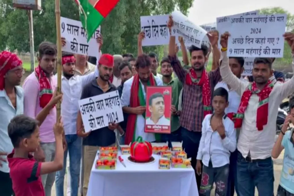 SP कार्यकर्ताओं ने अनोखे अंदाज में अखिलेश यादव का जन्मदिन मनाया। दरअसल, बीते कुछ दिनों से देशभर में ‘टमाटर’ की कीमतें तेजी से बढ़ी हैं। ऐसे में ‘टमाटर’ की बढ़ती कीमतों का विरोध करते हुए SP कार्यकर्ताओं ने ‘टमाटर’ से बना हुआ केक काटकर अखिलेश यादव को बधाई दी। जन्मदिन के इस सेलिब्रेशन में खास बात ये रही की पहले तो कार्यकर्ताओं ने केक काटकर अखिलेश यादव को बधाई दी और उसके बाद बढ़ती कीमतों का विरोध किया।