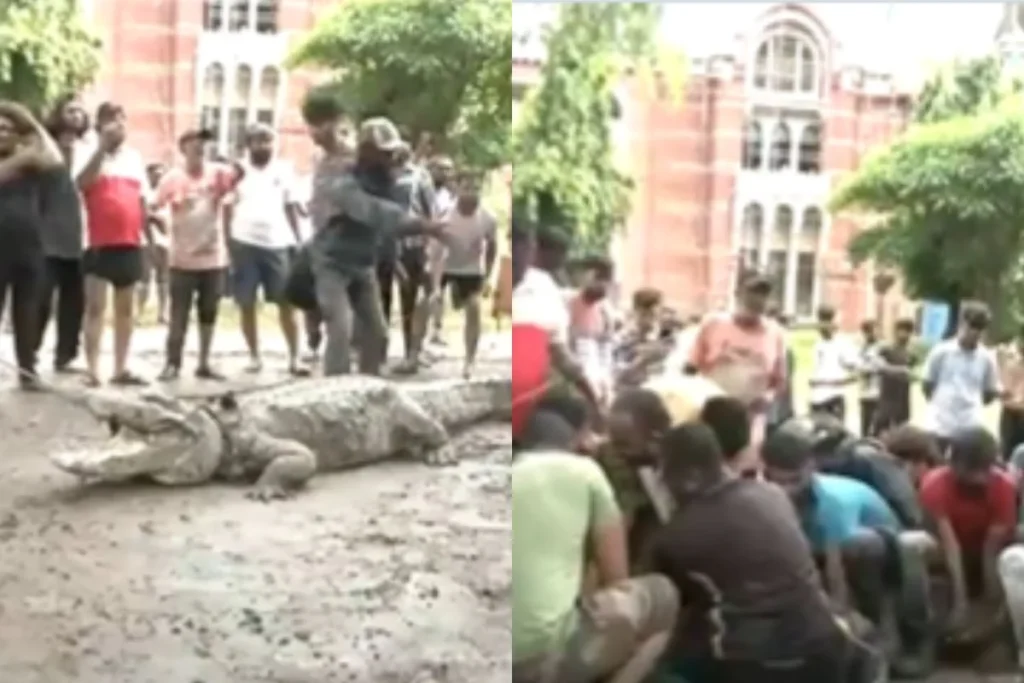 Viral Video: गुजरात में बारिश से लोग त्राहिमाम हो रहे हैं और वहीं भीषण बाढ़ के बीच कुछ ऐसा हुआ है जिसे देखने के बाद लोग हैरान रह गए हैं। गुजरात में बाढ़ के कहर के बीच कॉलेज के कैंपस में एक मगरमच्छ (Crocodile) दिखा। इस Viral Video ने सोशल मीडिया पर हलचल मचा दी है। वीडियो में आप देख सकते हैं कि वन विभाग के लोगों को रेस्क्यू करने में किस तरह पसीने छूट गए हैं और इसका पूरा वीडियो फिलहाल सोशल मीडिया पर खूब चर्चा में है। इसे देखने के बाद लोगों की रूह कांप उठी और आप खौफ में आ जाएंगे कि किस तरह इस मगरमच्छ को पकड़ा गया है।