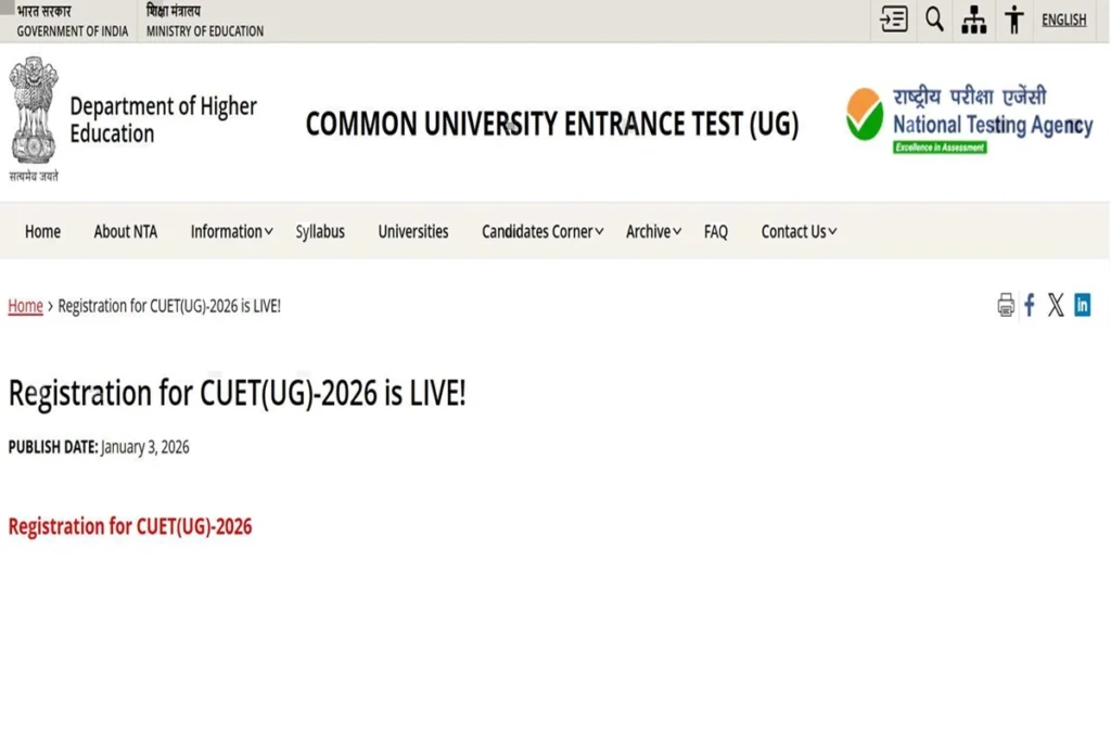 CUET UG 2026: स्नातक कोर्स में दाखिला लेने के इच्छुक अभ्यर्थी जो सीयूईटी यूजी के लिए आवेदन करना चाहते हैं, उनके लिए महत्वपूर्ण जानकारी है। एनटीए की ओर से आयोजित होने वाली सीयूईटी यूजी परीक्षा में रजिस्ट्रेशन करने की अंतिम तिथि अब नजदीक आ चुकी है। दरअसल, नेशनल टेस्टिंग एजेंसी द्वारा सीयूईटी यूजी 2026 के लिए ऑनलाइन एप्लीकेशन 30 जनवरी 2026 को बंद कर दी जाएगी। ऐसे में जो अभ्यर्थी सेंट्रल और दूसरी पार्टिसिपेटिंग विश्वविद्यालय में अंडरग्रेजुएट कोर्सेस में दाखिला लेना चाहते हैं, उन्हें 30 जनवरी 2026 रात 11 बजकर 50 मिनट तक ऑनलाइन रजिस्ट्रेशन प्रकिया संपन्न करना होगा। वहीं, ध्यान रहे कि एनटीए ने अभ्यर्थियों को सीयूईटी यूजी 2026 में आवेदन शुल्क जमा करने के लिए 31 जनवरी 2026 तक का वक्त दिया है।