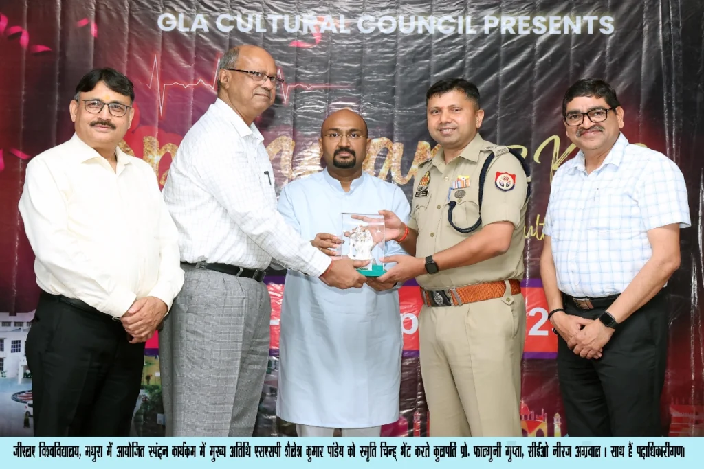 मुख्य अतिथि एसएसपी शैलेष कुमार पांडेय ने कार्यक्रम को संबोधित करते हुए कहा कि जीएलए विश्व विद्यालय अब प्रतिष्ठित विश्व विद्यालयों की श्रेणी में दर्ज हो चुका है। इस विश्व विद्यालय से वह काफी लंबे समय से जुडे़ हुए है। 8 वर्श पहले मथुरा में एसपी सिटी के पद पर सेवाएं देने के दौरान भी उन्होंने जीएलए के कई कार्यक्रमों में शामिल होकर रंगारंग और सांस्कृतिक कार्यक्रमों का लुत्फ उठाया है और अब फिर से विश्वविद्यालय के एक बड़े कार्यक्रम में शामिल होने का अवसर मिला है।उन्होंने कहा कि जानकारी के अनुसार विश्व विद्यालय का यह वार्षिक उत्सव कार्यक्रम कोरोना के चलते तीन वर्ष बाद आयोजित हो रहा है। इसका मुख्य कारण कोरोना की वह त्रासदी जो कभी बुजुर्गों ने भी नहीं देखी। ऐसी त्रासदी जिसने सभी लोगों को घरों में कैद कर दिया। हर घर का दरवाजा बंद करा दिया, लेकिन सभी ने इस चुनौती को डंके की चोट पर हराने का काम किया। उन्होंने कहा कि चुनौतियां आज के समय में कितनी भी हों, लेकिन अगर दृढ़ संकल्प के साथ हौंसला, धैर्य और विश्वास को लेकर आगे बढ़ा जाय तो चुनौतियां कहीं हद तक पीछे रह जाती हैं और हम सभी युवा आगे बढ़ते जाते हैं।इसलिए ऐसे कार्यक्रम क्लास रूम की शिक्षा से अलग हटकर विद्यार्थियां की रचनात्मकता में निखार लाते हैं। विद्यार्थियों को शिक्षा ग्रहण करने के साथ-साथ ऐसे आनंदित रचनात्मकता में निखार लाने वाले कार्यक्रमों में अक्सर प्रतिभाग करना चाहिए। क्योंकि खुले मंच पर कार्यक्रमों में अपनी रचनात्मकता दर्शाना बेहतर सीजीपीए लाने से कहीं अधिक होता है। इससे पता चलता है कि विद्यार्थी शिक्षा से अलग हटकर क्या कर सकता है ? जिस विद्यार्थी के हाथ में हुनर होता है वह कहीं भी किसी भी कठिन रास्ते पर रूक नहीं सकता।