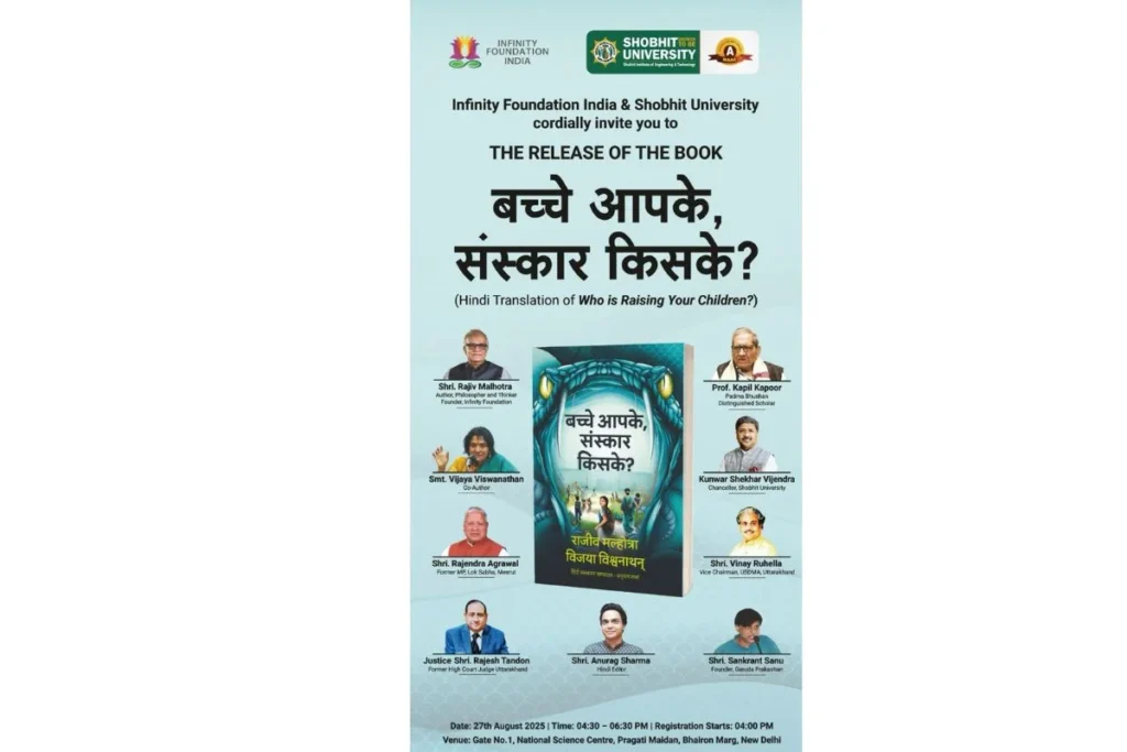 Shobhit University: श्री राजीव मल्होत्रा द्वारा लिखित किताब Who is Raising Your Children के हिंदी ट्रांसलेशन को लॉन्च किया जाएगा। शोभित यूनिवर्सिटी ने इंफिनिटी फाऊंडेशन इंडिया के साथ मिलकर लोगों को आमंत्रण भेजा है। Shobhit University इंफिनिटी फाऊंडेशन इंडिया के साथ बच्चे आपके संस्कार किसके का विमोचन करने के लिए तैयार है। इस दौरान कई मुख्य चेहरे नजर आने वाले हैं जिसकी जानकारी दी गई है। आइए जानते हैं आखिर Shri Rajiv Malhotra की इस किताब में क्या खास है और कब और कहां बच्चे आपके संस्कार किसके किताब को लॉन्च किया जाएगा।