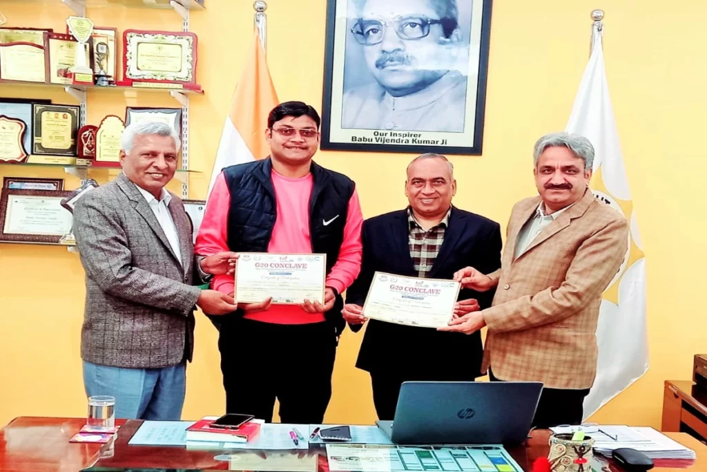 Shobhit University Gangoh: उत्तर प्रदेश स्थापना दिवस 24 जनवरी 2023 को प्रदेश सरकार के निर्देशानुसार जी-20 कॉन्क्लेव की बैठक में शोभित विश्वविद्यालय गंगोह के कुलपति प्रोफेसर (डा.) रणजीत सिंह जी एवं कुल सचिव प्रोफेसर (डा.) महिपाल सिंह जी के आश्वासन पर एसोसिएट प्रोफेसर(डा.) अभिमन्यु उपाध्याय व सहायक प्रोफेसर शक्ति सिंह को लखनऊ भेजा गया,जिसमें उत्तर प्रदेश के मुख्य सचिव श्री दुर्गा शंकर मिश्रा जी (IAS), श्री सुधीर बोवडेजी (IAS) प्रमुख सचिव, उच्च शिक्षा एवं अन्य प्रदेश के प्रशासनिक अधिकारियों ने जी-20 कॉन्क्लेव की बैठक में आए विभिन्न शिक्षण संस्थानों के शिक्षकों में डा. अभिमन्यु उपाध्याय व शक्ति सिंह को जी-20 के उद्देश्यों को प्रदेश मे जागरूकता के लिए एम्बेसडर बनाया गया।