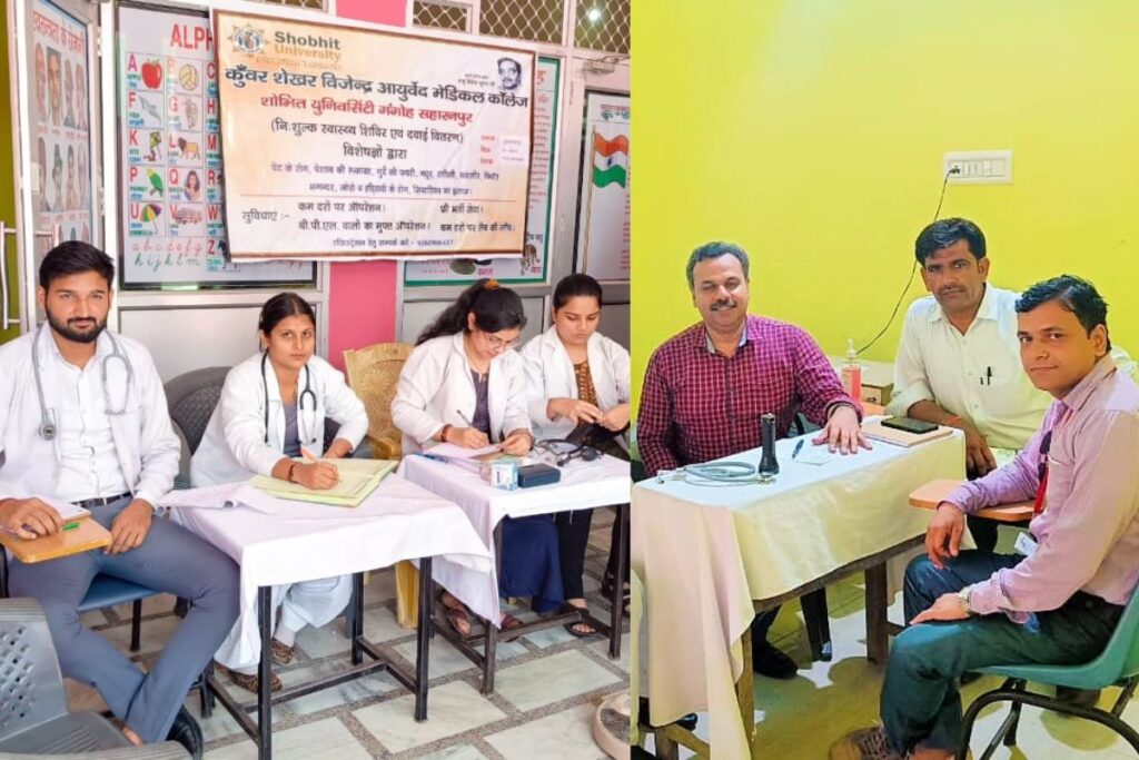 Shobhit University Gangoh: दिनांक 04.09.2023 को शोभित विश्वविद्यालय, गंगोह के कुंवर शेखर विजेंद्र आयुर्वेद मेडिकल कॉलेज एवं रिसर्च सेंटर द्वारा गांव गुरुनानक पूरा में श्री जितेंद्र जागलान के निवास स्थान पर निशुल्क चिकित्सा शिविर का आयोजन किया गया, जिसमे कुल 182 रोगियों को स्वास्थ्य परीक्षण कर निशुल्क दवाइयां वितरित की गई। जिसमें बवासीर, फिशर, अर्श, नासूर इत्यादि रोगों के विशेषज्ञ डॉ. कृष्णानंद, डॉ. रणजीत सिंह, डॉ. आयशा गोयल ने अपनी सेवाएं दी।