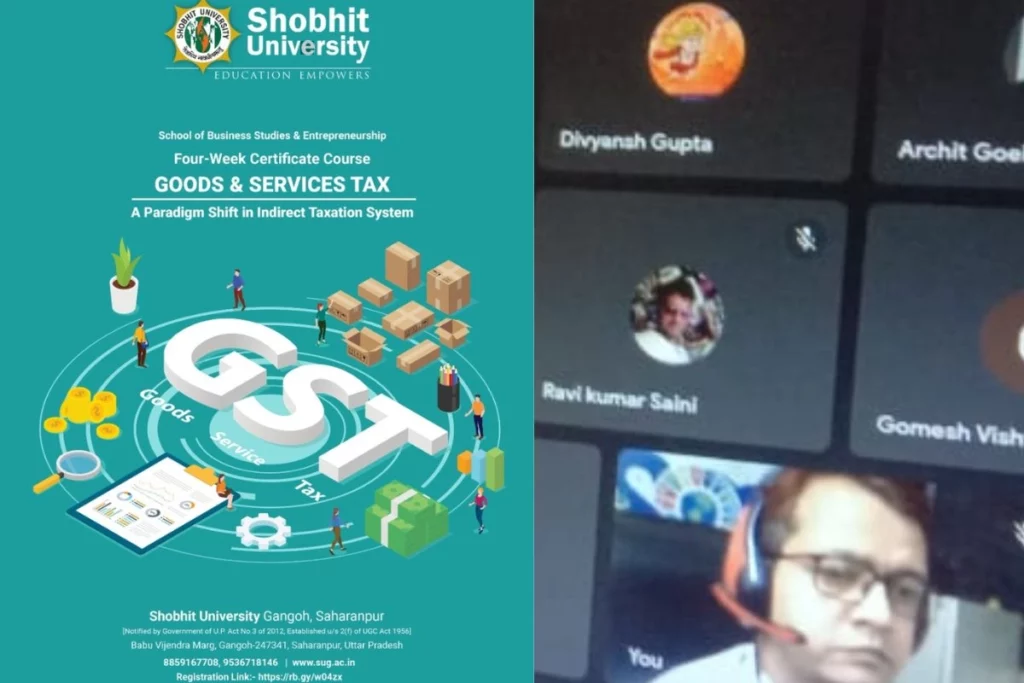 Shobhit University Gangoh: शोभित विश्वविद्यालय गंगोह में दिनांक 19-06-2023 को स्कूल ऑफ बिजनेस स्टडीज एंड एंटरप्रेन्योरशिप विभाग द्वारा गुड्स एंड सर्विसेज टैक्स पर चार सप्ताह का वैल्यू एडिड सर्टिफिकेट कोर्स (VACC) की शुरुआत की गई। इस कोर्स के माध्यम से छात्रों, टैक्स प्रोफेशनल, एवं अकाउंटेंटस को जीएसटी (GST) की बारीकियों से अवगत कराया जाएगा। इस पूरे कोर्स को स्कूल ऑफ बिजनेस स्टडीज एंड एंटरप्रेन्योरशिप विभाग के हेड डॉ. सोमप्रभ दुबे, चार्टर्ड अकाउंटेंट संदीप कुमार तिवारी एवं चार्टर्ड अकाउंटेंट प्रमोद तिवारी संबोधित करेंगे। इस कोर्स का समापन 15 जुलाई को किया जाएगा। इस कोर्स में कक्षा की अवधि प्रतिदिन डेढ़ घंटा रहेगी।