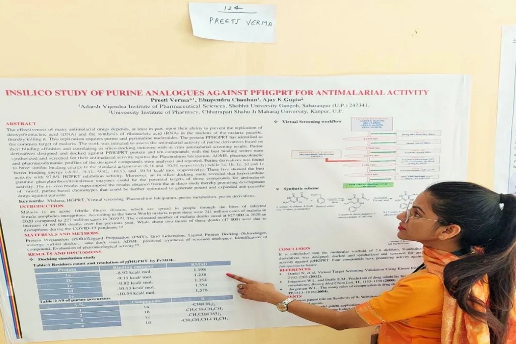 Shobhit University Gangoh: दिनांक 28-02-2023 में बुंदेलखंड विश्वविद्यालय के फार्मेसी संस्थान द्वारा आयोजित दो दिवसीय अंतर्राष्ट्रीय कॉन्फ्रेंस ‘न्यू पैराडिग्मा इन फार्मास्यूटिकल रिसर्च एंड डेवलपमेंट’ 2023 के अंतर्गत इस दो दिवसीय अंतरराष्ट्रीय कांफ्रेंस में स्कूल ऑफ फार्मेसी शोभित विश्वविद्यालय, गंगोह की रिसर्च स्कॉलर प्रीति वर्मा ने पोस्टर प्रेजेंटेशन में प्रथम स्थान प्राप्त कर विश्वविद्यालय का नाम रोशन किया है। इस कॉन्फ्रेंस में प्रीति वर्मा ने “इनसिलिको स्टडी ऑफ़ प्यूरीन अनलॉगिएस अगेंस्ट पीएफएचजीपीआरटी फॉर एंटीमलेरियल एक्टिविटी” विषय पर शोध पत्र भी प्रस्तुत किया।