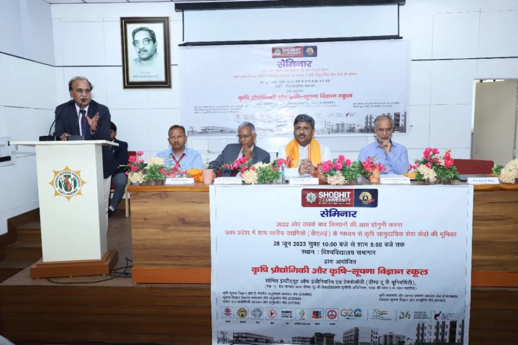Shobhit University: शोभित विश्वविद्यालय, मेरठ, उत्तर प्रदेश में “2022 और बाद में किसानों की आय को दोगुना करना – ग्रामीण समुदाय सेवा केंद्रों के माध्यम से ग्राम स्तरीय उद्यमियों की भूमिका” नामक एक महत्वपूर्ण सेमिनार आज उत्तर प्रदेश में सफलतापूर्वक आयोजित किया गया। इस सेमिनार का उद्देश्य था किसानों की आय को बढ़ाने के लिए रणनीति और समाधानों का अन्वेषण करना। कृषि क्षेत्र के प्रमुख विशेषज्ञ, नीति निर्माता, शोधकर्ता और हितधारक इस कार्यक्रम में एकत्र हुए थे, जहां उत्तर प्रदेश में ग्रामीण समुदाय सेवा केंद्रों और ग्राम स्तरीय उद्यमियों की महत्वपूर्ण भूमिका पर चर्चा की गई। चर्चा में किसानों की आय को दोगुना करने में अग्रणी भूमिका पर जोर दिया गया। सेमिनार उद्घाटन के साथ प्रारम्भ हुआ, जिसमें शोभित इंस्टीट्यूट ऑफ इंजीनियरिंग एंड टेक्नोलॉजी, मेरठ के प्रो वाइस-चांसलर, प्रो. (डॉ.) जयानंद द्वारा स्वागत भाषण किया गया।