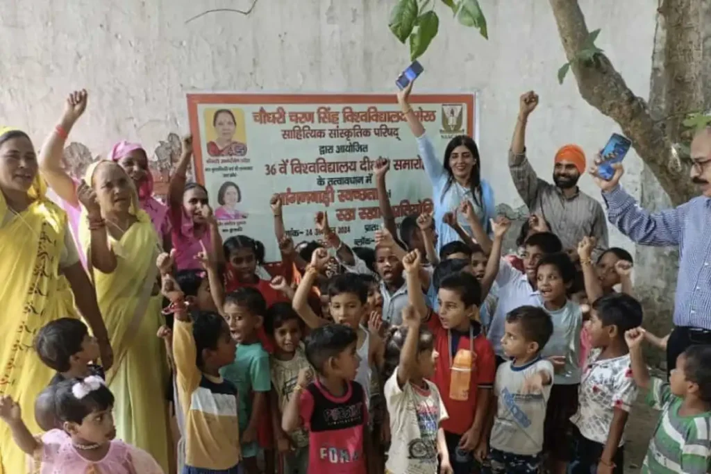 इसी प्रकार डालमपुर के 3 आंगनबाड़ी केंद्र, मीरपुर के 3 आंगनबाड़ी केंद्रों पर टीम गई। इसी प्रकार साहित्यिक सांस्कृतिक परिषद के समन्वयक प्रोफेसर कृष्णकांत शर्मा के नेतृत्व में दूसरी टीम सिखेड़ा के 4 आंगनबाड़ी केंद्र तथा लालपुर के 1 आंगनबाड़ी केंद्र पर गई। टीम ने वहां पर बास्केटबाल म्यूजिकल चेयर खेल खिलाए तथा आंगनबाड़ी केंद्रों में पड़ने वाले बच्चों के नाखून, ड्रेस , उपस्थिति को देखा। हर वर्ष की भांति इस वर्ष भी दीक्षांत समारोह से पहले दीक्षोत्सव का आयोजन किया गया जा रहा है। इसके तहत चौधरी चरण सिंह विश्वविद्यालय द्वारा लिए गए पांच गांवों में विभिन्न प्रकार की प्रतियोगिताओं का आयोजन किया गया है। प्रोफेसर नीलू जैन गुप्ता ने कहा कि विश्वविद्यालयों द्वारा जिन 05 ग्रामों को गोद लिया गया है, इन ग्रामों के अन्तर्गत आने वाले आंगनवाड़ी केन्द्रों में प्रतियोगिता आयोजित कराने का निर्णय लिया गया।