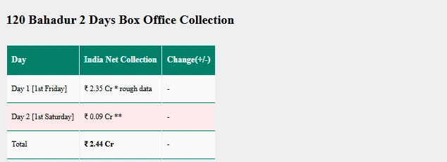 इसमें मेजर शैतान सिंह भाटी का रोल फरहान अख्तर ने निभाया है। उनकी एक्टिंग की काफी तारीफ हो रही है। ‘120 बहादुर’ लगभग 85 करोड़ की लागत से बनी मूवी है। पहले दिन इस फिल्म ने 2.35 करोड़ का कलेक्शन किया है। ये कमाई मेकर्स को निराश कर सकती है। लेकिन इसके रिव्यू ऑडियंस में जोश भरने वाले हैं।