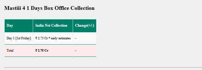 ऑडियंस के प्यार और डिमांड को देखते हुए एक बार फिर से विवेक ओबेरॉय, आफताब शिवदसानी और रितेश देशमुख की तिगड़ी फिर से हाजिर हुई है। इस बार ‘मस्ती 4’ को एक एडल्ट कॉमेडी से लैस है। इसके ट्रेलर को लेकर काफी चर्चा थी। लगभग 40 करोड़ की लागत से बनी इस कॉमेडी फिल्म ने पहले दिन 2.75 करोड़ का कलेक्शन किया है। जो कि, फरहान अख्तर की ‘120 बहादुर’ से बस थोड़ा सा ज्यादा है। ‘120 बहादुर’ ने पहले दिन 2.35 करोड़ का कलेक्शन किया है। इस वीकेंडे दोनों के बीच काफी टक्कर देखने को मिल सकती है। फिलहाल ऑपनिंग डे पर दोनों स्लो रफ्तार से आगे बढ़ रही हैं। बॉक्स ऑफिस कलेक्शन के ये आंकड़े Sacnilk ने जारी किए हैं।