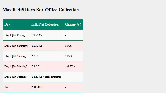 रितेश देशमुख, विवेक ओबेरॉय और आफताब शिवदासानी की एडल्ट कॉमेडी लोगों को ज्यादा रास नहीं आ रही है। इसका अदाजा फिल्म के स्लो कलेक्शन से लगाया जा सकता है। ‘मस्ती 4’ ने टोटल कमाई 11.70 करोड़ रुपए की है। रिलीज के पांचवें दिन इस फिल्म ने 1.630 करोड़ का कलेक्शन किया। ये ‘120 बहादुर’ से सिर्फ 10 लाख ज्यादा है। आपको बता दें, टोटल कलेक्शन में फरहान अख्तर की फिल्म ‘120 बहादुर’ आगे चल रही है। इसने अभी तक 13 करोड़ रुपए कमाए हैं। दोनों ही फिल्मों के बॉक्स ऑफिस कलेक्शन को देखकर लग रहा है कि, ये फ्लॉप साबित होती हुई दिख रही हैं। ये कमाई के आंकड़े Sacnilk ने जारी किए हैं।