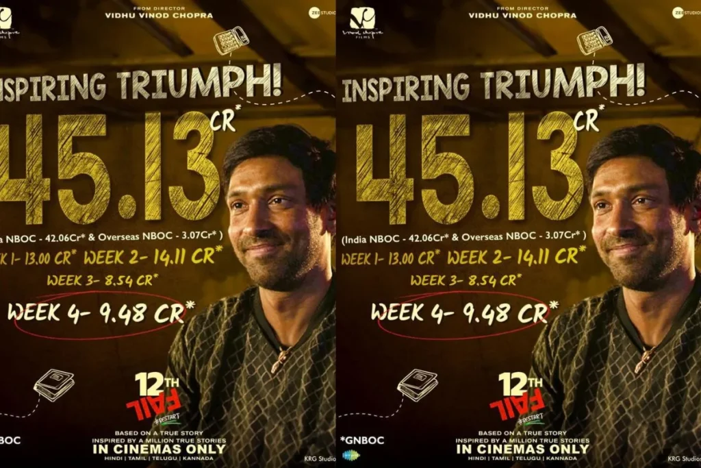 सिनेमाघरों में चार सप्ताह के उल्लेखनीय प्रदर्शन के बाद, “12वीं फेल” ने भारत में 42.06 करोड़ रुपये की शानदार कमाई की है, जबकि विदेशी बाजारों में भी 3.07 करोड़ रुपये की शानदार कमाई की है। फिल्म की वैश्विक कमाई प्रभावशाली 53 करोड़ रुपये है।