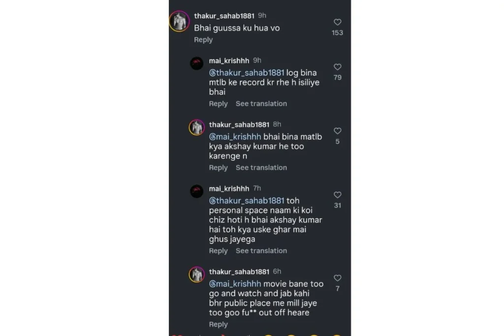 सिरफिरे फैन के द्वारा शेयर किए गए इस वीडियो को देख अक्षय कुमार के फैंस हैरान रह गए। Akshay Kumar के साथ Video के अंत में फैन पोज देते हुए भी नजर आ रहा है। जहां एक यूजर ने कहा भाई गुस्सा क्यों हुआ वह तो इस पर फैन ने जवाब दिया लोग बिना मतलब के रिकॉर्ड कर रहे हैं इसलिए भाई। एक ने कहा तो पर्सनल स्पेस नाम की कोई चीज होती है भाई अक्षय कुमार है तो क्या उसके घर में घुस जाएगा। एक यूजर ने कहा जब कोई मूवी आने वाली होती है तब इनका रवैया अलग होता है।