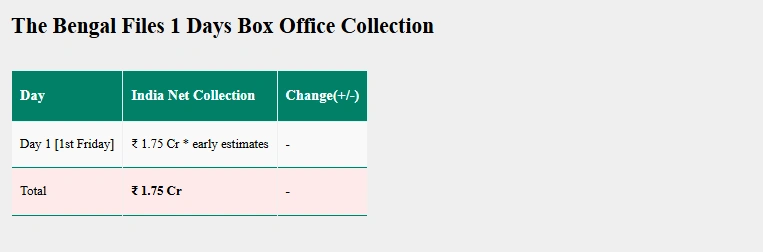 विवेक अग्निहोत्री के द्वारा बनाई गई ‘द बंगाल फाइल्स’ फिल्म का पहले ही दिन बॉक्स ऑफिस पर बुरा हाल है। लगभग 35 करोड़ की लागत से बनी इस मूवी ने पहले दिन 1.75 करोड़ रुपए कमाए हैं।ये फिल्म 1940 में बंगाल में हुई हिंसा पर आधारित है।