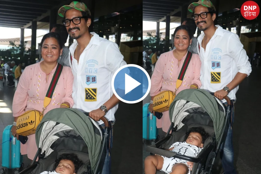 Bharti Singh: भारती सिंह और हर्ष लिंबाचिया अपने बेटे गोला यानी लक्ष्य को लेकर आए दिन सोशल मीडिया पर चर्चा में बने रहते हैं। यह बात सच है कि भारती जब भी स्पॉट होती हैं अपने बेटी गोला को लेकर चर्चा में होती हैं। इस बीच एक बार फिर कपल को बेटे गोला के साथ एयरपोर्ट पर स्पॉट किया गया। इस दौरान हर्ष और भारती अपने बेटे के साथ में नजर आए और गोला सोया हुआ था। सोशल मीडिया पर यह वीडियो वायरल हो रहा है जिसमें भारती अपने फैंस के साथ पोज देती नजर आ रही है और लोगों की निगाहें गोला पर है।
