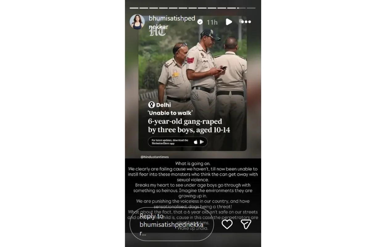 भूमि पेडणेकरने इस पोस्ट में कहा, “क्या हो रहा है… हम साफ़ तौर पर फेल हो रहे हैं क्योंकि हम अब तक इन हैवानों में डर नहीं भर पाए हैं जो सोचते हैं कि वे सेक्शुअल वायलेंस से बच सकते हैं। यह देखकर मेरा दिल टूट जाता है कि कम उम्र के लड़के इतनी घिनौनी हरकत करते हैं। सोचिए वे किस माहौल में बड़े हो रहे हैं। हम अपने देश में बेज़ुबानों को सज़ा दे रहे हैं, और कुत्तों को खतरा बताकर सनसनी फैला रहे हैं। इस बात का क्या, कि एक 6 साल का बच्चा हमारी सड़कों पर सेफ़ नहीं है और असल में कोई बच्चा नहीं है, क्योंकि इस मामले में तो गुनाहगार भी खुद पीड़ित हैं। जागो इंडिया।”