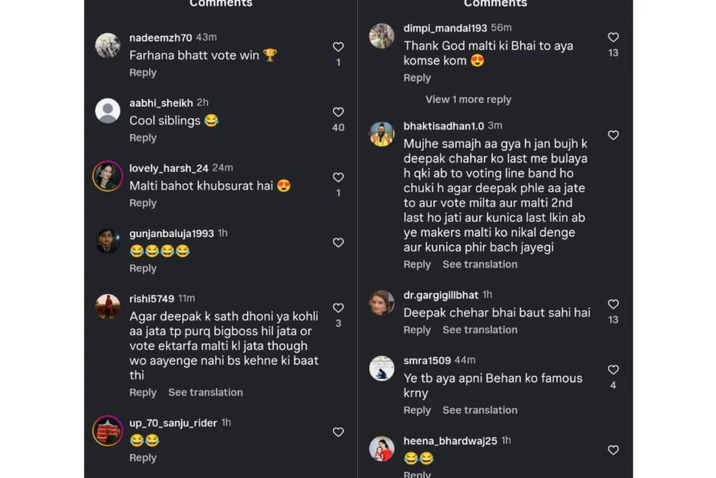 मालती चाहर के भाई दीपक चाहर को बिग बॉस 19 में देखकर एक यूजर ने लिखा, “मुझे समझ आ गया है कि जानबूझकर दीपक कर को लास्ट में बुलाया गया क्योंकि अब तो वोटिंग लाइन बंद हो चुकी है। अगर दीपक पहले आ जाते तो और वोट मिलता और मालती सेकंड लास्ट हो जाती और कुनिका निकल जाती लेकिन अब यह मेकर्स मालती को निकाल देंगे।” वहीं एक यूजर ने कहा अगर दीपक के साथ धोनी या कोहली आ जाता तो पूरा बिग बॉस हिल जाता और वोट एक तरफ मालती को जाता कुछ लोग मालती को फेमस होने के साथ विनर भी बता रहे हैं।