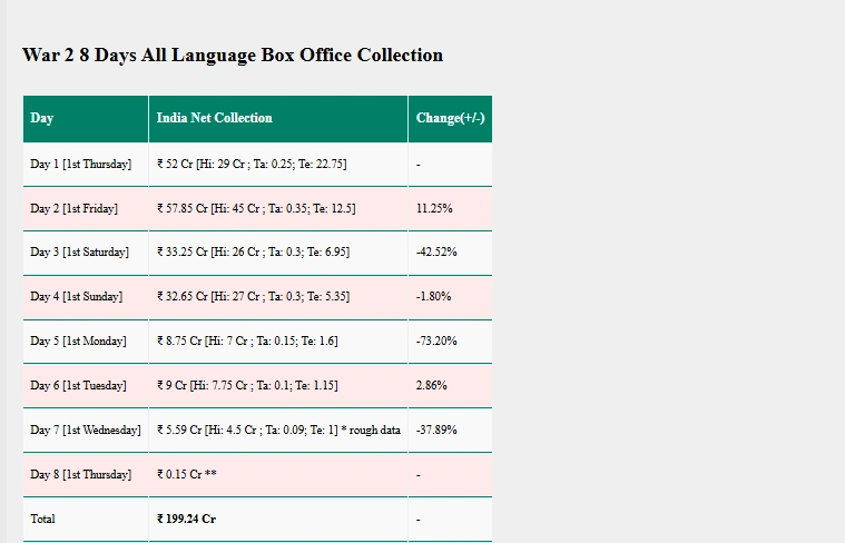 अयान मुखर्जी की ये फिल्म लगभग 300 करोड़ के कलेक्शन से तैयार हुई है। ऑपनिंग डे पर 52 करोड़ कमाने वाली इस मूवी ने अभी तक 199.24 करोड़ का कलेक्शन कर लिया है। रिलीज के सातवें दिन वॉर 2 की कमाई में कमी आयी है। इस मूवी ने 5.59 करोड़ का कलेक्शन किया है। ये अभी तक की सबसे ज्यादा गिरावट है। इसकी वजह लोग कुली को मान रहे हैं। क्योंकि दोनों एक ही दिन रिलीज हुई थीं। ऐसे में कुली 200 करोड़ कमा चुकी है वहीं, वॉर 2 अभी तक भारत में 200 करोड़ नहीं कमा सकी है। टोटल कलेक्शन और पर डे कलेक्शन में रजनीकांत की कुली आगे चल रही है। कमाई के ये आंकड़े Sacnilk ने जारी किए हैं।