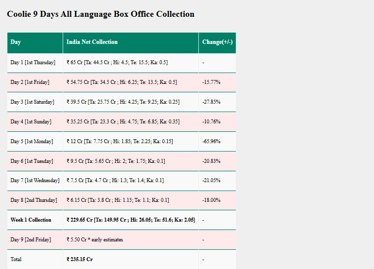 लेकिन अभी तक ये फिल्म सिर्फ 235.15 करोड़ रुपए ही कमा सकी है। ऑपनिंग डे पर ये कमाई 65 करोड़ थी। लेकिन धीरे-धीरे इसमें गिरावट आती गई और इसकी हालत खराब होती दिख रही है। कुली ने 9वें दिन 5.50 करोड़ का कलेक्शन किया है।ये अभी तक की सबसे कम कमाई है। Coolie Worldwide Box Office Collection 450 करोड़ रुपए है।