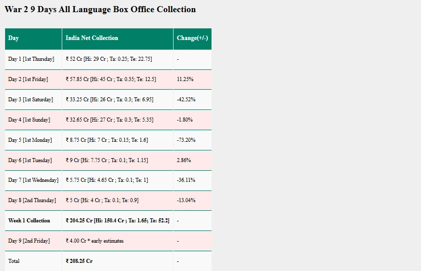 War 2 Box Office Collection Day 9 में भी आयी गिरावट