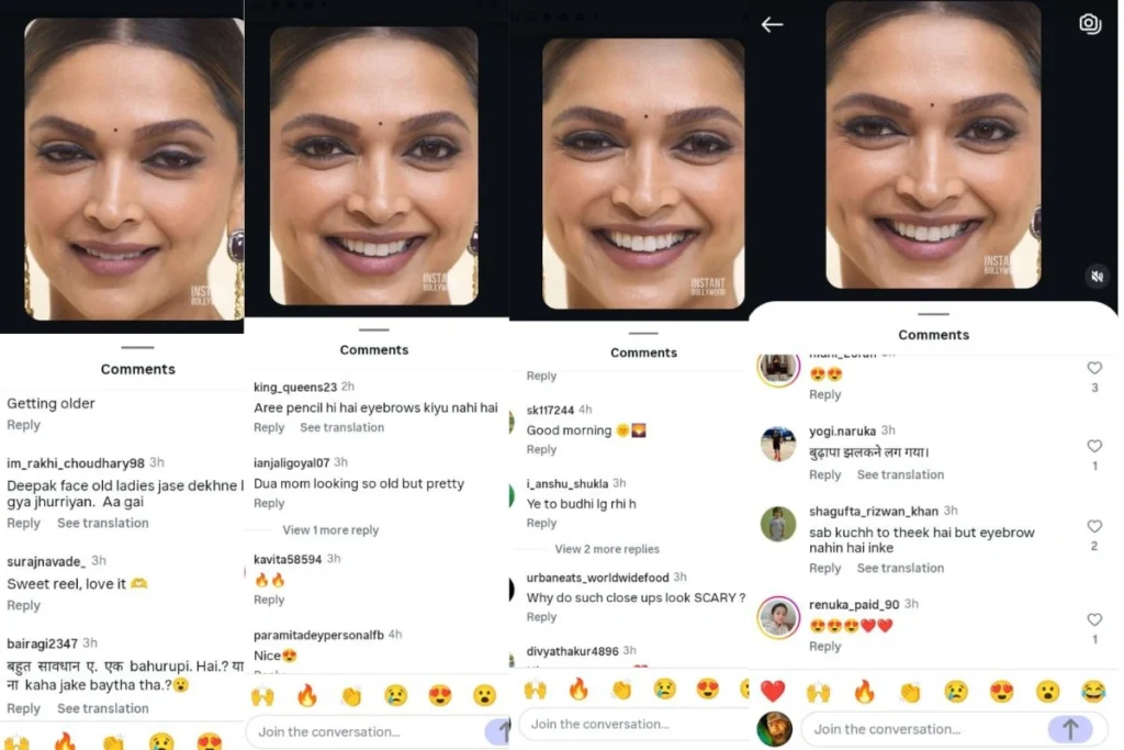 वहीं, एक और यूजर लिखता है, ‘बूढ़ापा झलकने लगा है’। वहीं, एक और यूजर एक्ट्रेस की झुर्रियों पर कमेंट करते हुए लिखता है कि, ‘दीपिका का फेस ओल्ड लेडिज जैसा दिखने लगा है झुर्रियां आ गई हैं। सोशल मीडिया पर एक्ट्रेस को काफी ज्यादा ट्रोल किया जा रहा है।