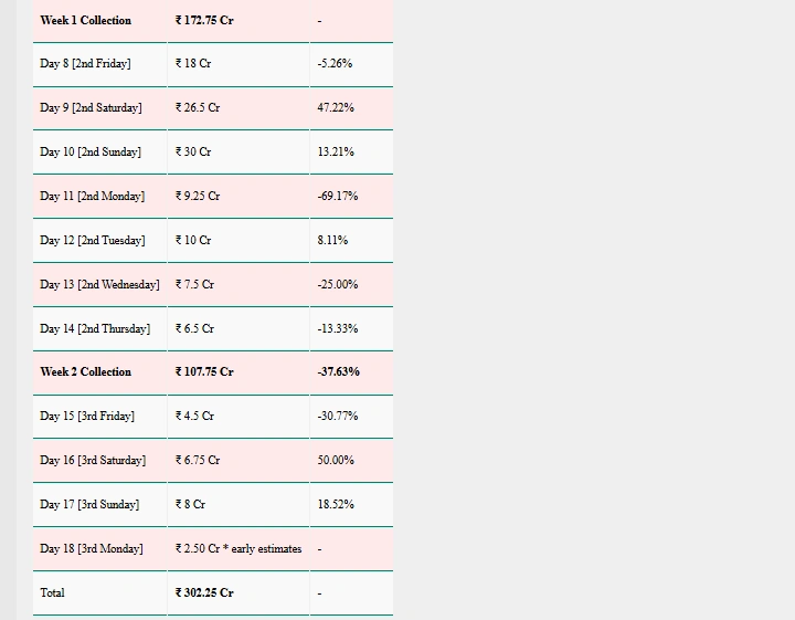 60 करोड़ के बजट से बनी ये फिल्म अभी तक सिर्फ भारत में ही 302.25 करोड़ रुपए कमा चुकी है। सैयारा एक लव स्टोरी है जो कि, सीधे मूवी लवर्स को दिलों में उतर रही है। सैयारा ने ऑपनिंग डे पर 21.5 करोड़ का कलेक्शन किया था। इसके साथ ही 16वें दिन ये कमाई 6.75 करोड़ रुपए थी। वहीं, 17वें दिन सैयारा का कलेक्शन 8 करोड़ तक पहुंच गया है।