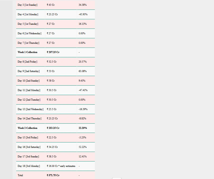 धुरंधर ने 18वें दिन 16 करोड़ का भारत में बॉक्स ऑफिस कलेक्शन किया है। ऑपनिंग डे पर 43 करोड़ रुपए कमाने वाली रणवीर सिंह की इस मूवी की रिलीज के बाद अब तक की ये सबसे कम कमाई है। 280 करोड़ की लागत से बनी धुरंधर ने भारत में 571.75 करोड़ का बॉक्स ऑफिस कलेक्शन कर लिया है।