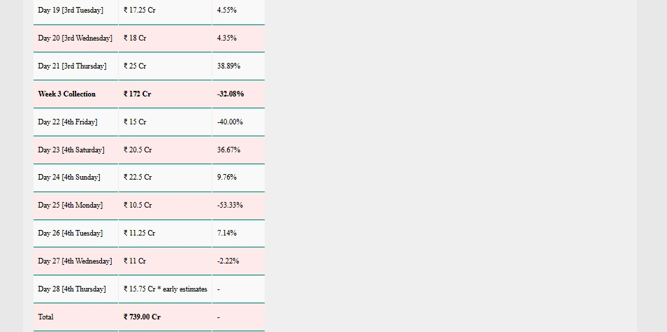 मूवी भारत में रिलीज के 28 दिनों के अंदर 739 करोड़ रुपए कमा चुकी है। वहीं, धुरंधर का वर्ल्ड वाइड टोटल कलेक्शन 1500.75 करोड़ रुपए हो चुका है। भारतीय जासूस की कहानी दिखाती ये फिल्म लोगों को खूब पसंद आ रही है। सबसे ज्यादा पसंद पाकिस्तानी गैंगेस्टर रहमान डकैत का किरदार निभाने वाले अक्षय खन्ना को किया जा रहा है। इस फिल्म में संजय दत्त, अर्जुन रामपाल, आर. माधवन के साथ सारा अर्जुन भी है। धुरंधर बॉक्स ऑफिस कलेक्शन के ये आंकड़े Sacnilk ने जारी किए हैं।